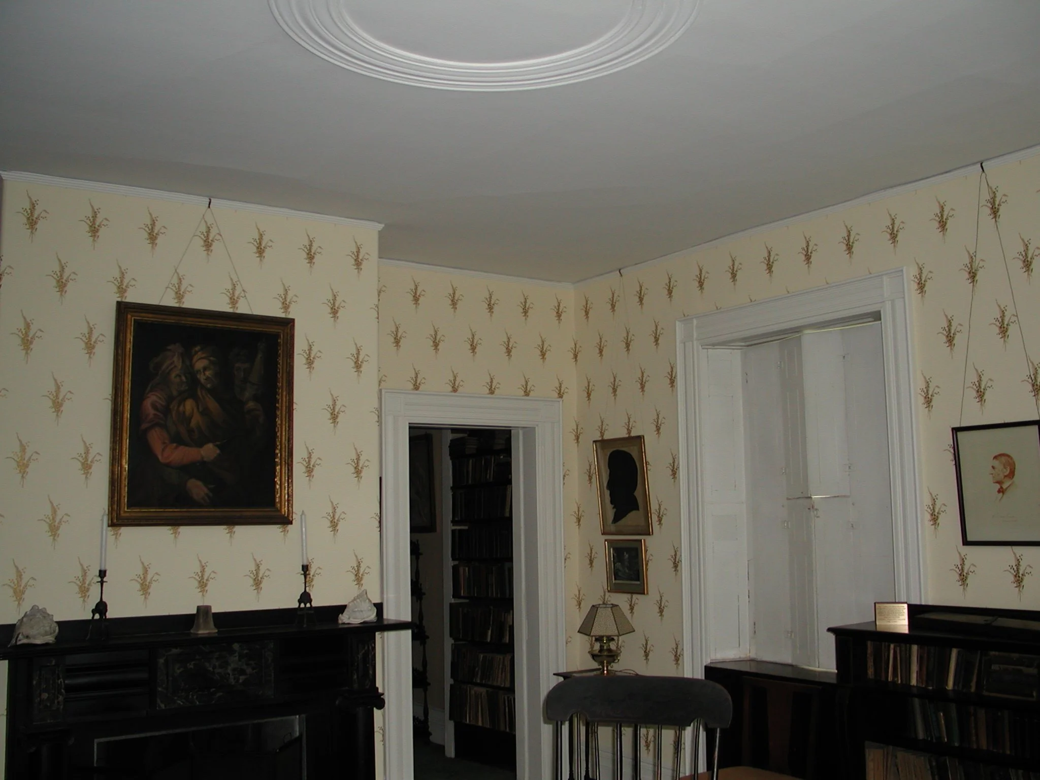Emerson study after being refurbished with paint and paper. The ceiling was "rolled and tipped" with a flat oil base paint. This method was used so as to produce brush strokes vs. roller texture, providing for a more authentic finish. (Paint rollers were not invented until 1944).
